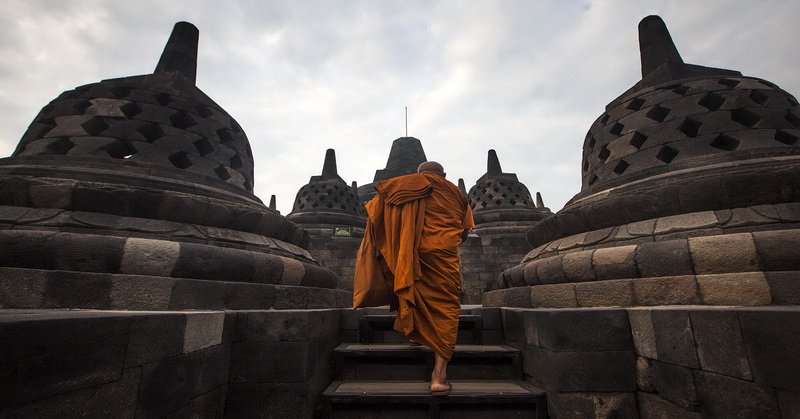 Seorang biksu melakukan ziarah di Candi Borobudur, Magelang, Jateng, Jumat (20/5). Ziarah yang diikuti oleh para biksu dan umat Budha itu guna merefleksikan ajaran Sang Budha serta untuk menyambut Waisak 2560 BE/2016. ANTARA FOTO/Andreas Fitri Atmoko/aww/16.