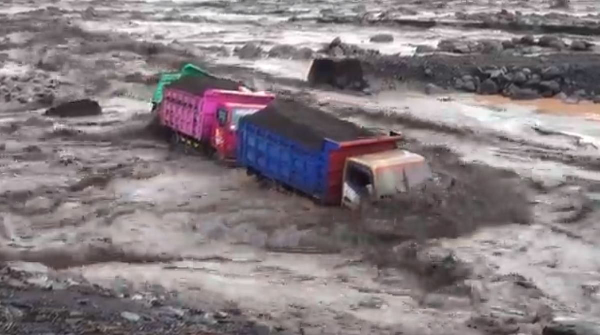 Dua truk yang berada di tengah sungai bahkan terguling karena derasnya terjangan arus banjir.