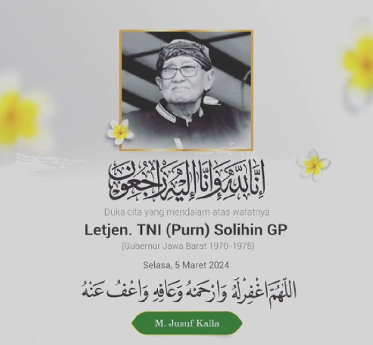 Mantan Gubernur Jawa Barat Letjen TNI (Purn) Solihin GP meninggal dunia pada Selasa (5/3/2024).